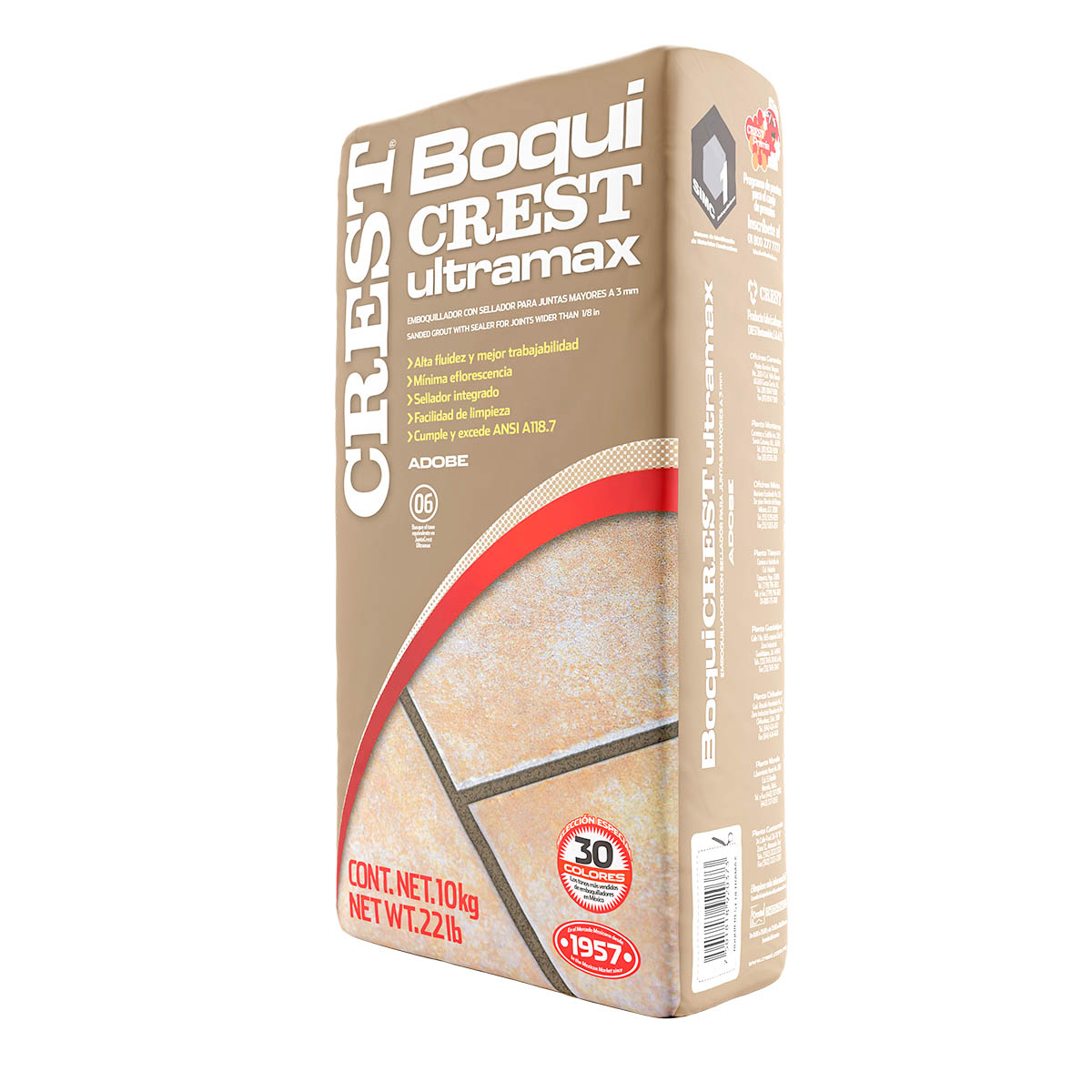 La Boquilla / Junta de la marca Crest, modelo BoquiCrest Ultramax, color Adobe viene en una presentación de 10 kg. Adhesivo reforzado para instalar todo emboquillador con arena sílica para juntas mayores a 3 mm