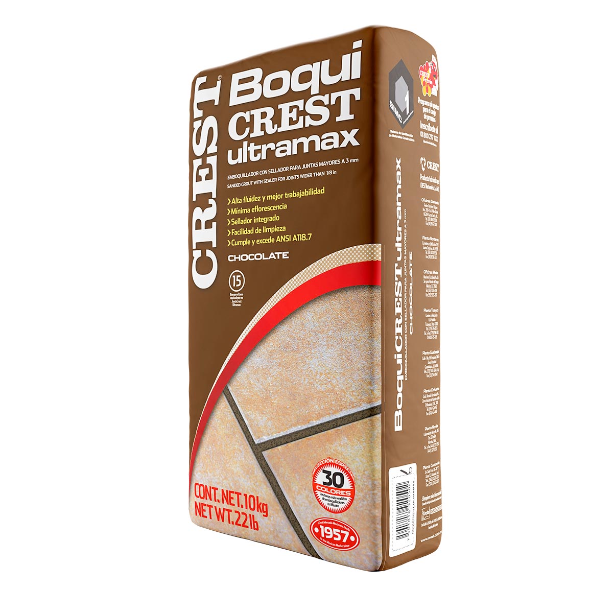 La Boquilla / Junta de la marca Crest, modelo BoquiCrest Ultramax, color Chocolate viene en una presentación de 10 kg. Adhesivo reforzado para instalar todo emboquillador con arena sílica para juntas mayores a 3 mm