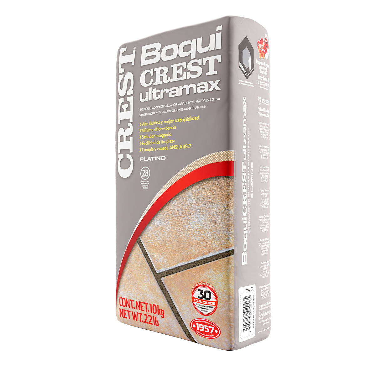 La Boquilla / Junta de la marca Crest, modelo BoquiCrest Ultramax, color Platino viene en una presentación de 10 kg. Adhesivo reforzado para instalar todo emboquillador con arena sílica para juntas mayores a 3 mm