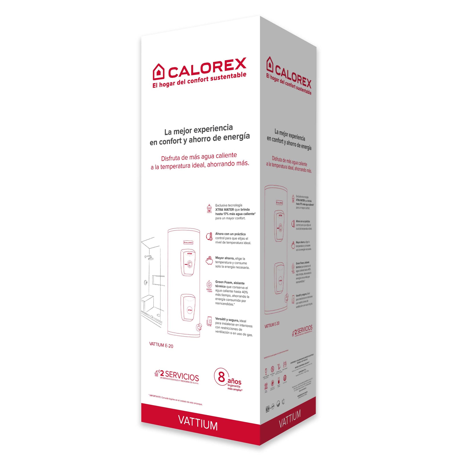 Disfuta de más agua caliente con la temperatura ideal, ahorrando más con calentador E-20 Vattium 220v eléctrico Calorex. Su exclusiva tecnología XTRA WATER que brinda hasta 17% más de agua caliente para un mayor confort. Ahora con un práctico control para que elijas el nivel de temperatura ideal. Mayor ahorro, elige la temperatura y consume solo la energía necesaria. Versátil y seguro, ideal para instalarse en interiores con restricciones de ventilación o en uso de gas.