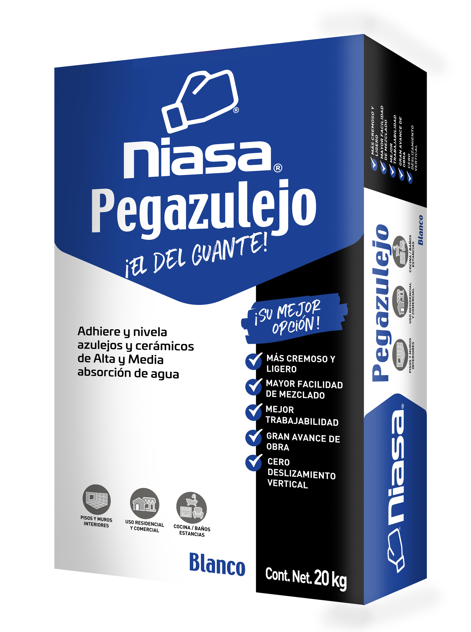 El adhesivo de la marca Niasa, modelo Pegazulejo, lo encuentras en una presentación de 20 kg. Su tipo de adherencia Química lo convierte en el complemento ideal para la colocación de tu recubrimiento de preferencia. Ya sea para pisos y muros cerámicos, porcelanatos, piedra, vitroblock, azulejo veneciano, tenemos el ideal para ti Adhesivo para colocar azulejos y mosaicos en formatos de hasta 40 x 40 cm, tanto en pisos como en muros interiores y exteriores. Máxima adhesión y durabilidad